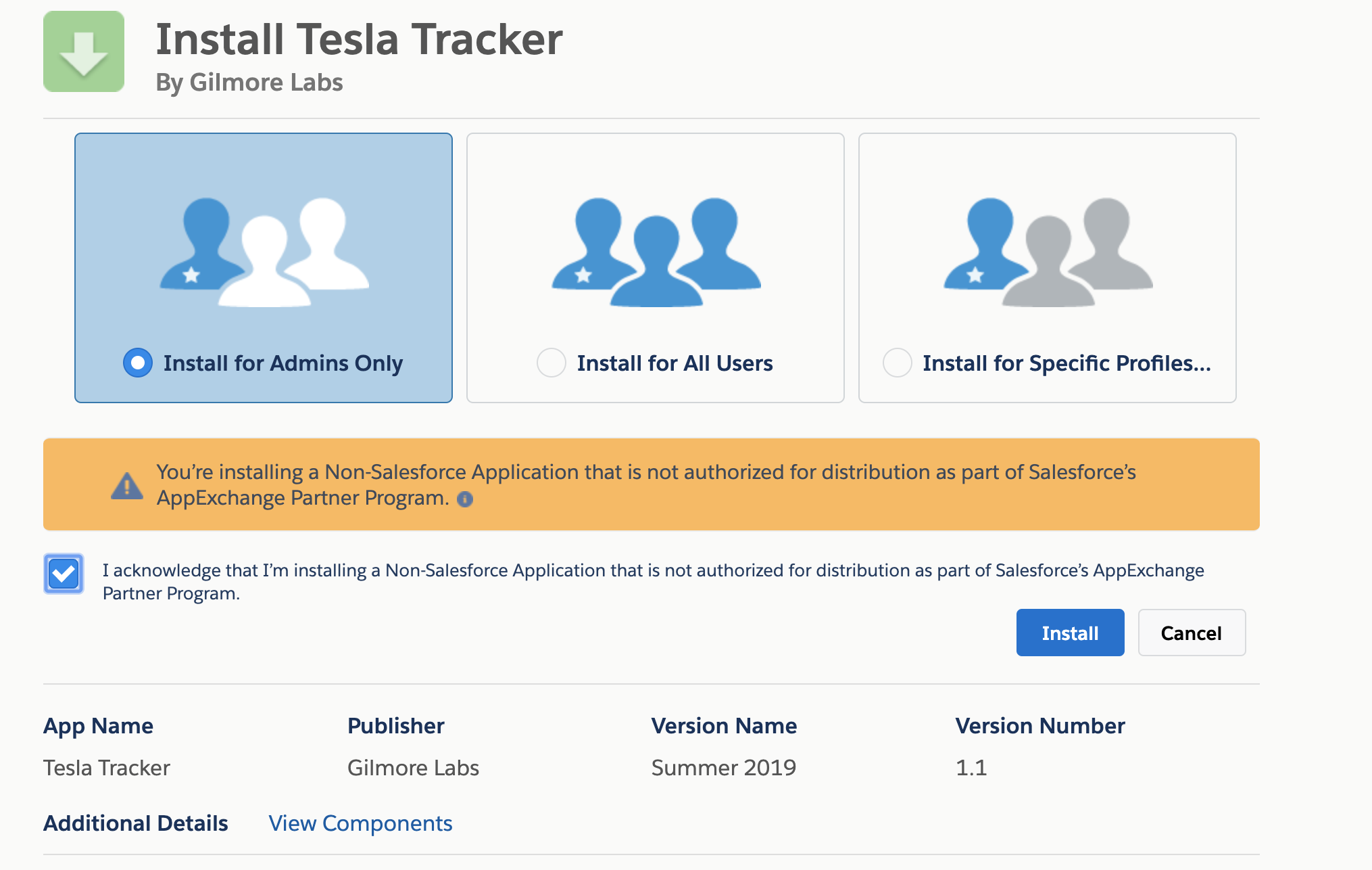 This application is NOT affiliated with either Tesla OR Salesforce. This app is meant to be a proof of concept around connecting two great platforms together. Neither Tesla, Salesforce, nor Gilmore Labs is responsible for anything related to abuse, privacy, or security related issues involved with installing or using this app. See the site’s terms and conditions.